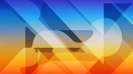 An abstract geometric composition featuring overlapping translucent shapes in a vibrant gradient of blue, orange, and yellow, creating a dynamic...