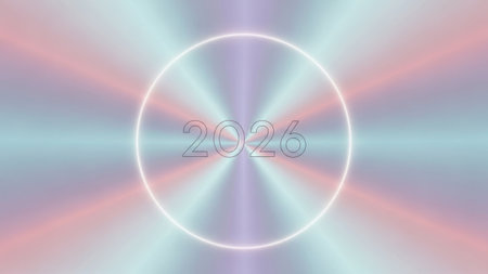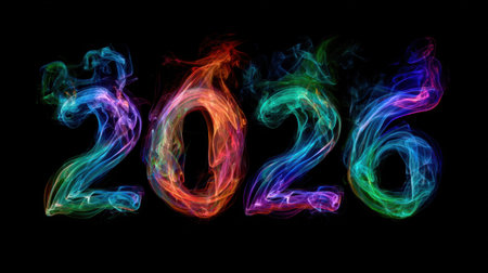 Colorful smoke forms numbers 2026, creating vibrant and dynamic visual effect against black background. This artistic representation symbolizes celebration and anticipation for upcoming year
