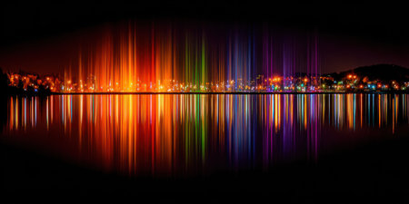 Colorful light streaks reflect in dark water, creating a vibrant scene with cityscape and a mountain