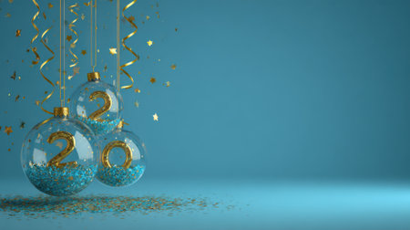 Transparent glass baubles with golden 2024 numbers and sparkling confetti against a teal background, symbolizing the upcoming New Year.