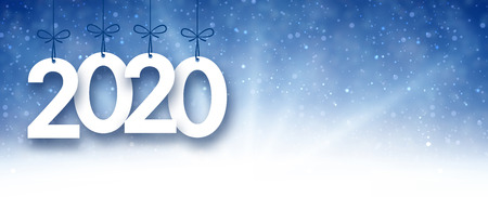 Blue shiny 2020 New Year banner with snow. Vector background.