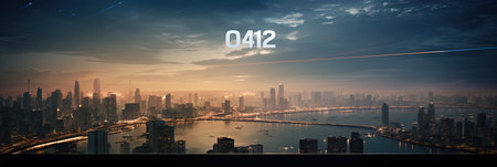An Illuminated cityscape at twilight with fiery and icy numbers displayed AI generate
