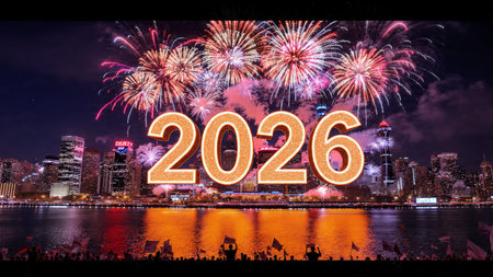 Golden sunrise illuminates the year 2026 over silhouetted mountain ranges and dramatic clouds.
