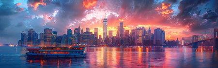 Panoramic view of Manhattan skyline during a cloudy sunset from the ferry boat