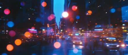 An abstract photograph captures the beauty of out-of-focus city lights at night, creating a mesmerizing bokeh effect. The colorful circles of light in shades of orange, blue, green, and white overlap against a dark background, evoking a vibrant and dreamy urban atmosphere.