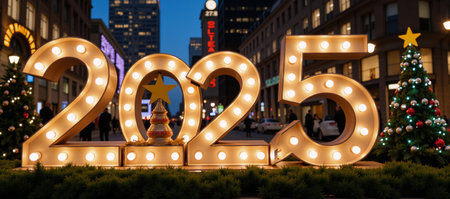 Brightly lit 2025 sign surrounded by festive lights and colorful decorations, celebrating the New Year with a vibrant and joyful ambiance.