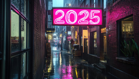 Pink neon sign with the number 2025 illuminating a rainy alley at night, creating reflections on the wet pavement