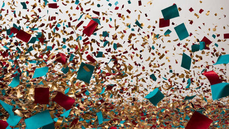 Red, gold, and teal confetti exploding against a white background, creating a vibrant and festive atmosphere, perfect for celebrations