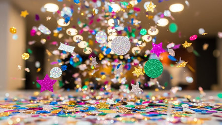 A vibrant cascade of colorful confetti and shimmering glitter falls and swirls in mid-air, illuminated by a bright, luminous light source creating a dynamic,...