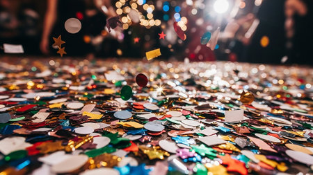 Floor showing a low angle view of a dense carpet of colorful confetti and streamers scattered on a floor with blurred bokeh lights in the background during a...
