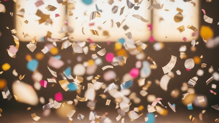 showing colorful confetti falling and floating in the air against a softly blurred background of warm light, creating a festive and celebratory atmosphere....