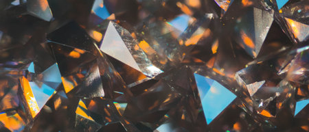 Shimmering crystals in warm tones create a vibrant and dynamic visual experience, highlighting reflections and textures in an abstract background