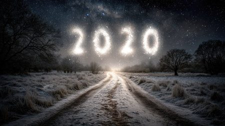 A stunning display of fireworks forms the numbers 2020 against a serene winter night sky, illuminating a snowy landscape along a winding road.