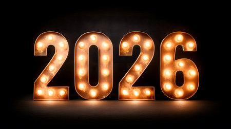 Illuminated 2026 numbers recreating a marquee light sign, representing new year, future, and celebration