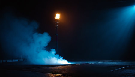 Spotlight creates a dramatic light cone capturing atmospheric intensity