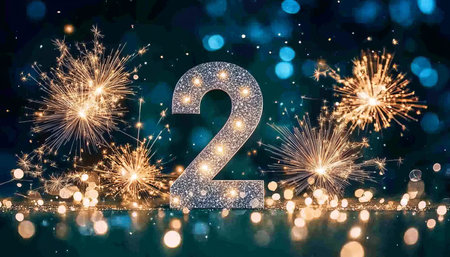 A Festive Celebration with Shimmering Silver Number Two Surrounded by Fireworks and Bokeh Lights