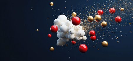 Colorful spheres and particles explosion on a dark background, showcasing a dynamic composition of white, red, and gold elements in an artistic arrangement