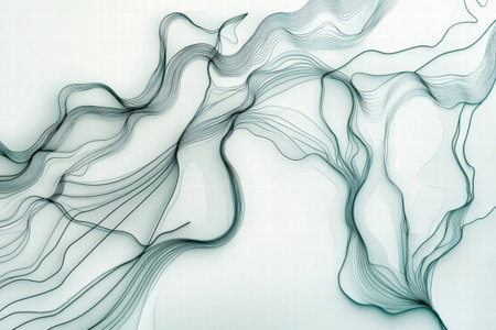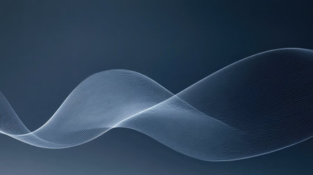 An abstract composition features a flowing wave-like structure composed of numerous parallel lines. The image showcases a blend of cool colors, predominantly blues and whites, with a subtle gradient effect. The design suggests a digital or scientific context. Suitable for graphic design or conceptual presentations.
