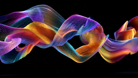 A mesmerizing abstract image featuring colorful mesh waves with a neon glow effect against a dark background, creating a dynamic and futuristic visual representation.