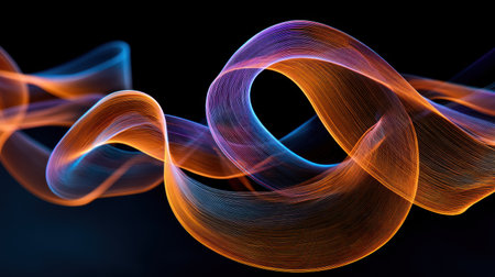 A stunning abstract design features flowing lines in vibrant hues of teal, orange, and yellow, creating a mesmerizing wave-like effect. This captivating artwork evokes a sense of movement and energy, perfect for adding a modern touch to any digital or print project.