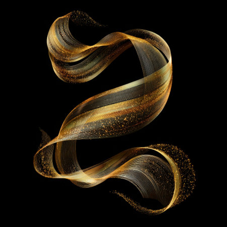 Golden glitter particles and flowing ribbons creating a dynamic, luxurious abstract wave or swirl shape, representing elegance, celebration, and premium quality against a dark background