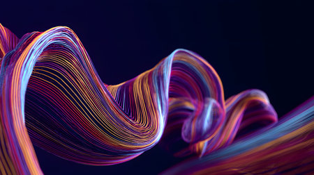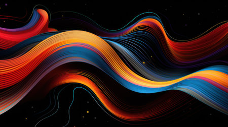 Vibrant abstract wave patterns on a black background showcase smooth lines with dynamic movement, perfect for creative design and art projects.