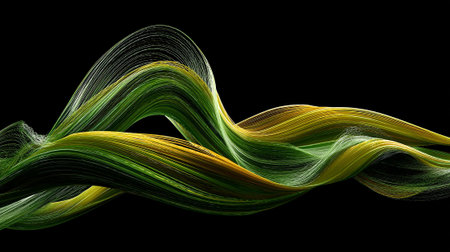 Graceful Flow: Abstract Green and Yellow Ribbon Waves Against Black