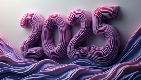The image features the year 2025 crafted from flowing pink and purple lines, creating a dynamic and modern look. The wavy texture adds depth and movement, evoking a sense of excitement and anticipation for the new year.
