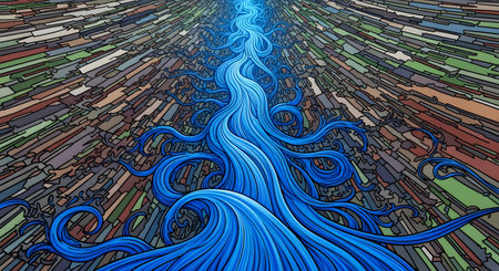 An abstract digital illustration of a vibrant blue, stylized river flowing into the distance. The surrounding landscape is made of fragmented, colorful geometric shapes, creating a sense of perspective and digital flow. This represents flow, data, and abstract art.