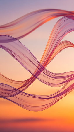Translucent ribbons in shades of purple and orange flow in waves against a soft gradient sky resembling a sunset or twilight.