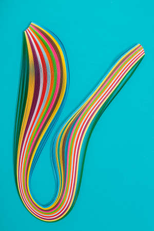 A creative flat lay showcasing a collection of colorful paper quilling strips arranged into abstract, curving shapes on a white background