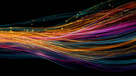 A collection of colorful threads are featured against a dark background. The strands are arranged in a flowing, wave-like pattern, showcasing a spectrum of colors from red and orange to green and blue. This artistic composition offers versatility for commercial design and advertising applications.
