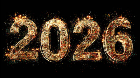Golden numbers 2026 sparkle against dark background, creating festive and celebratory atmosphere filled with shimmering lights and glittering particles
