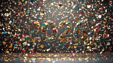 3D metallic 2026 numbers illuminated by fireworks and surrounded by colorful confetti, sparkling and festive atmosphere