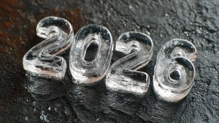 Crystal clear ice numbers 2026 sit on a dark surface symbolizing the arrival of a fresh New Year filled with hope and new beginnings.