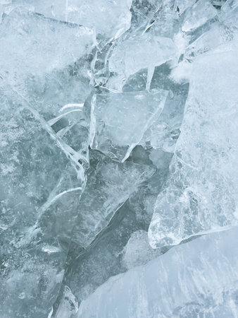 Transparent blue ice with cracks and ice floes on Baikal lake in winter. Abstract winter nature background.