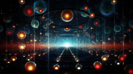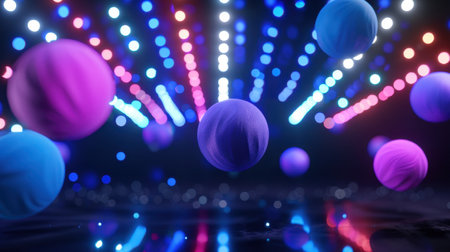 A vibrant composition featuring colorful floating spheres illuminated by bright light effects against a dark background, creating a captivating, futuristic scene.