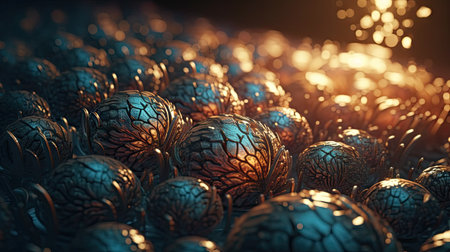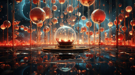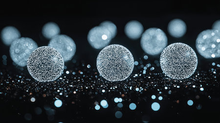 Futuristic abstract background featuring chrome spheres and glitter in dark space