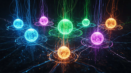 Zdfzdf showing glowing spheres of light in various colors connected by digital circuits on a dark background. resolution