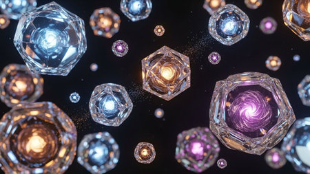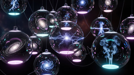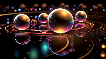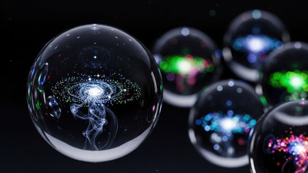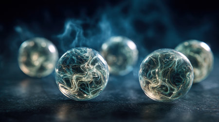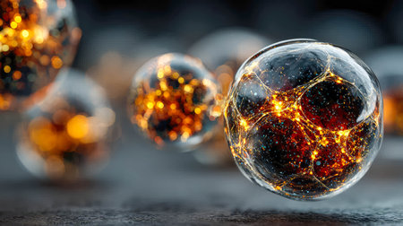This image features several transparent spheres, each showcasing a complex, galaxy-like pattern within. The spheres appear to float against a dark background, with various light sources reflecting different colors. This abstract design could be used in science, technology or artistic projects and is suitable for a wide range of editorial or commercial purposes.