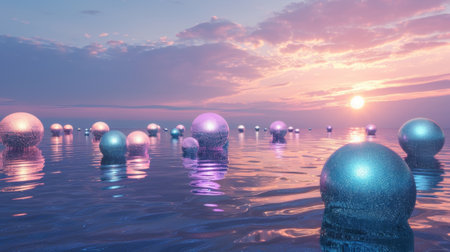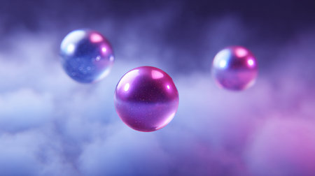 A stunning image showcasing floating colorful spheres surrounded by a soft misty backdrop. The vibrant hues of purple, pink, and blue create an enchanting atmosphere perfect for artistic or modern themes.