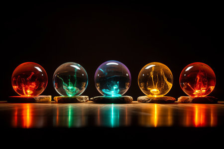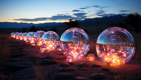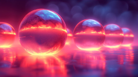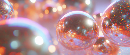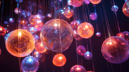 Elegant floating glass spheres reflecting multicolored lights generative ai