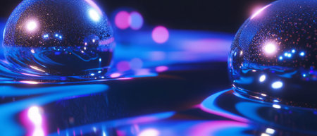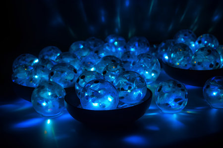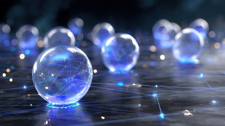 This captivating image features transparent spheres illuminated by blue light on a dark surface, symbolizing technology and interconnectedness in a futuristic setting.
