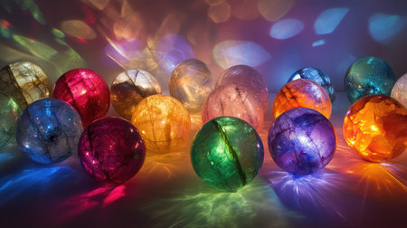A stunning arrangement of colorful glass orbs illuminated by vibrant bokeh lighting, creating an enchanting and dreamy atmosphere perfect for artistic displays.