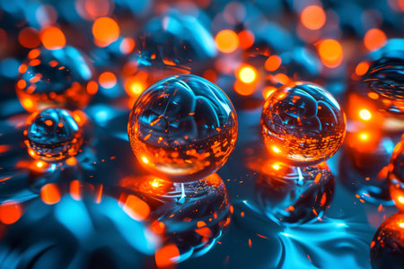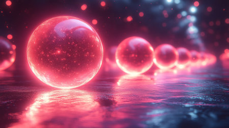 Glowing red spheres reflecting on wet surface with bokeh lights, futuristic atmosphere. Modern technology and innovation concept