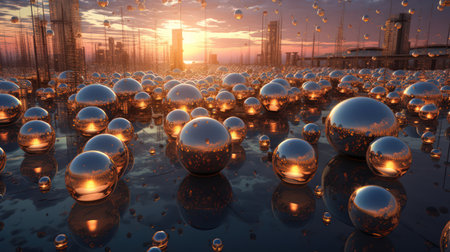 A mesmerizing display of glistening spheres, cascading in a rhythmic dance, reflecting the vibrant lights of an unseen cityscape.