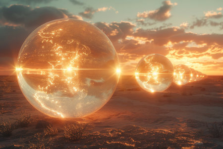 Three large, glowing spheres in a desert landscape