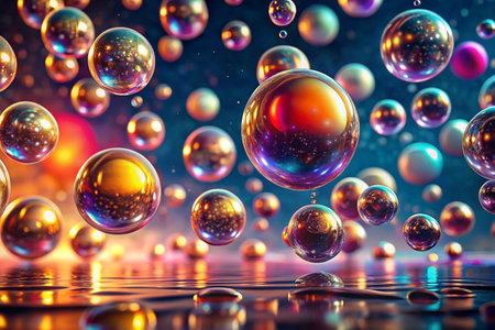Floating spheres, iridescent, night sky, reflected light, abstract background