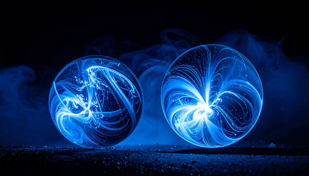 Floating glass orbs radiate swirling patterns of light, creating a mystical ambiance in a dim environment, captivating those who gaze upon them.