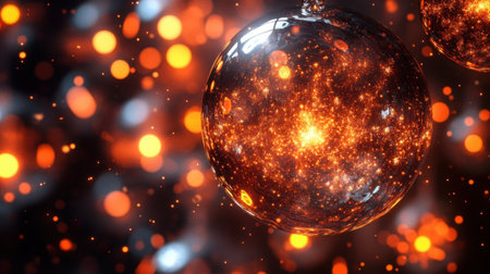 Close up of a luminous, orange hued glass sphere adorned with sparkling particles, set against a backdrop of blurred bokeh lights, creating a festive